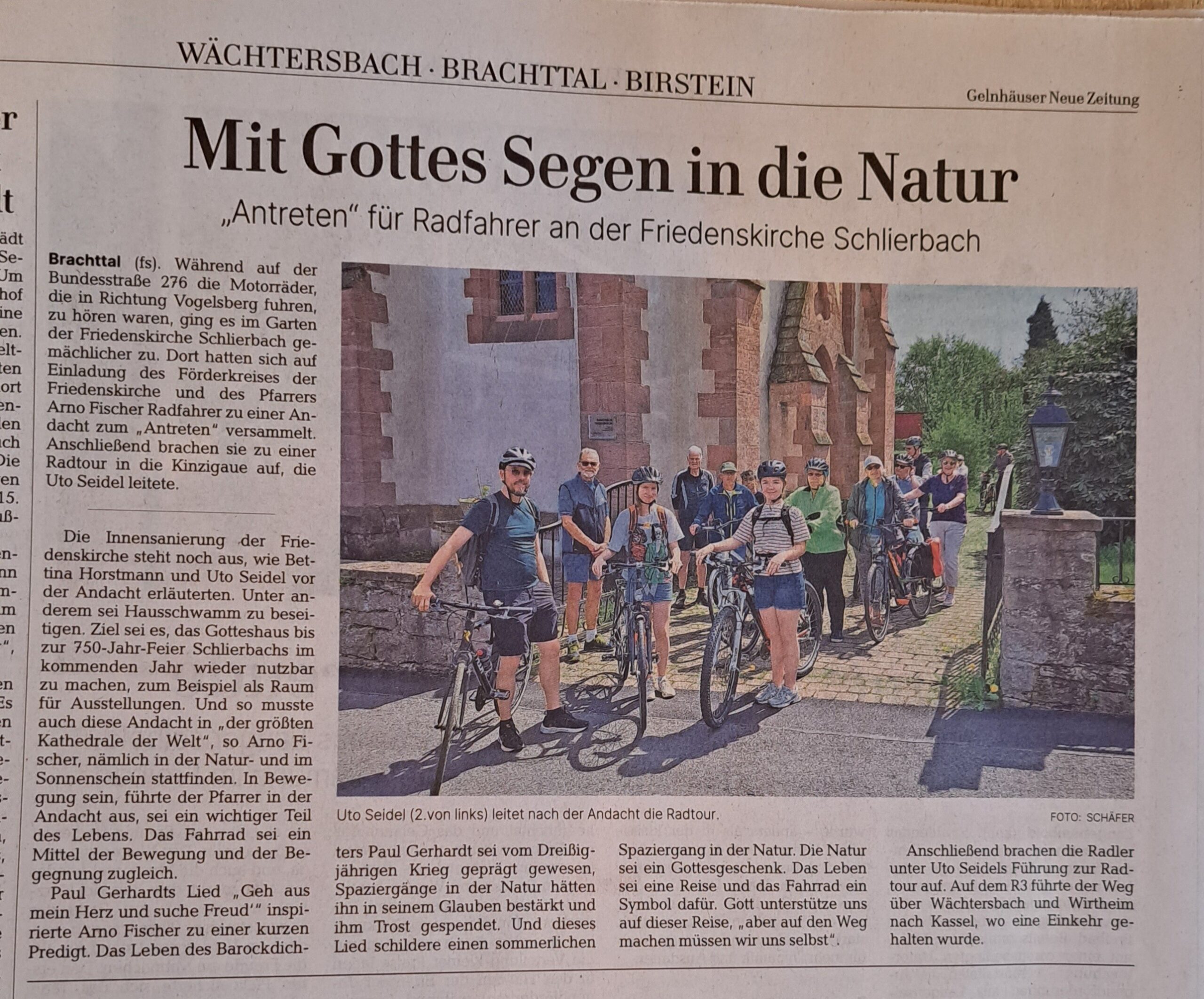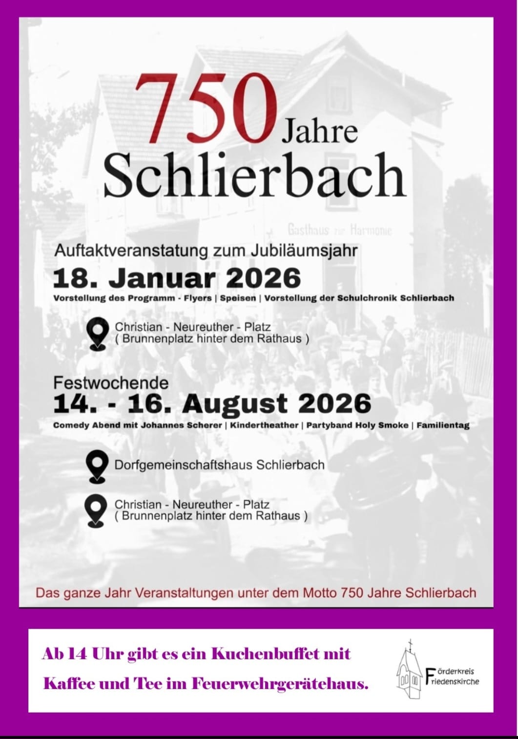 Der Förderkreis Friedenskirche ist Teil der Auftaktveranstaltung zur 750 Jahrfeier Schlierbach am 18. Januar. Wir bieten ab 14 Uhr im Feuerwehrgerätehaus Kuchen, Kaffee und Tee an.